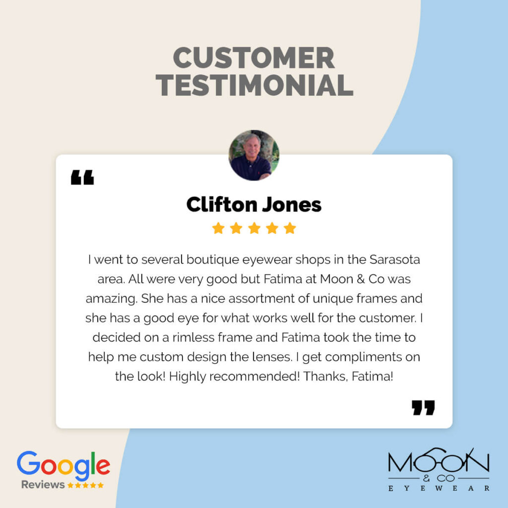 04 Jul Blog Customer Testimonial October 17, 2022 By Fatima Moon I went to several boutique eyewear shops in the Sarasota area. All were very good but Fatima at Moon & Co was amazin...Continue reading