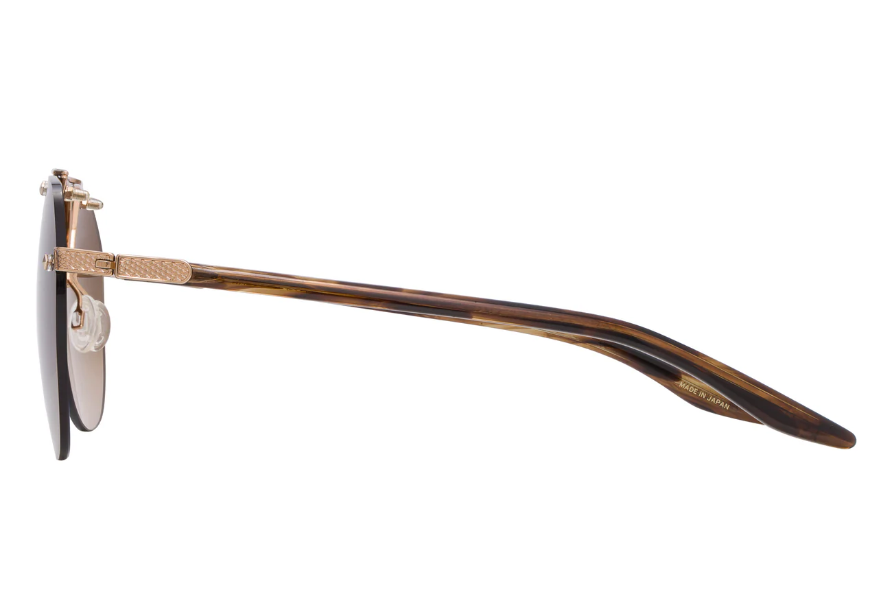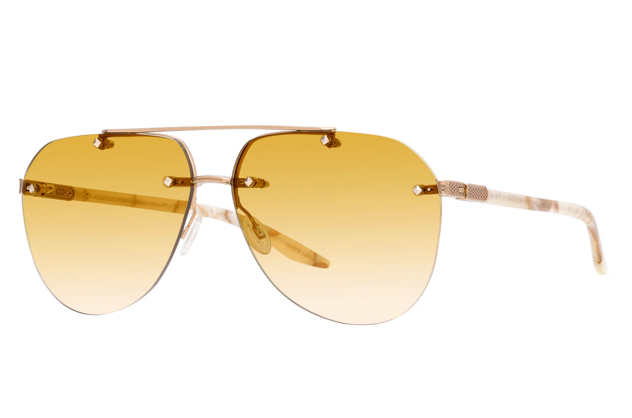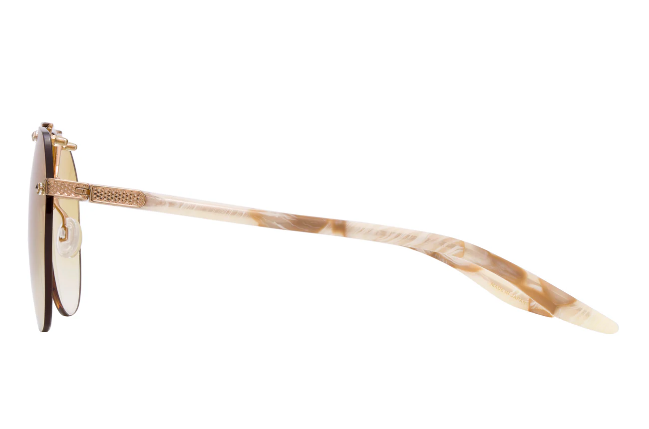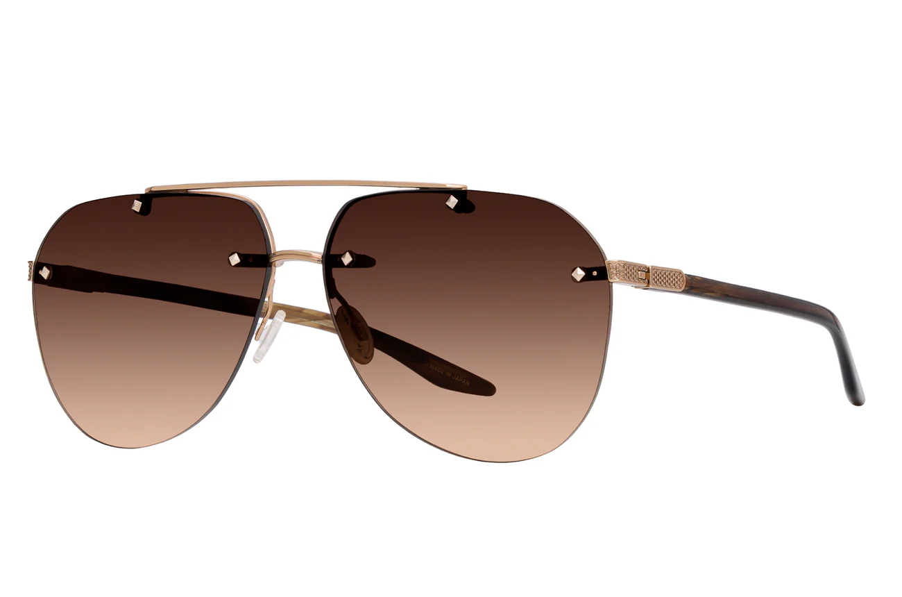 This elevated aviator features sculptural hardware and distinctive filigree details. Custom jewel-tone lens colors and beautifully hand polished acetate temples featuring 24K gold detailing evoke a heightened sense of luxury.