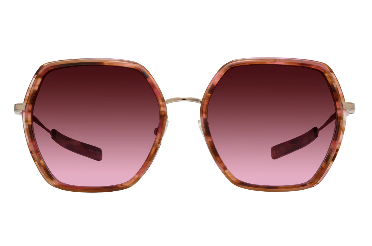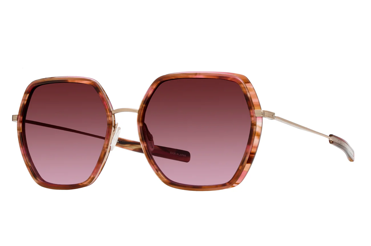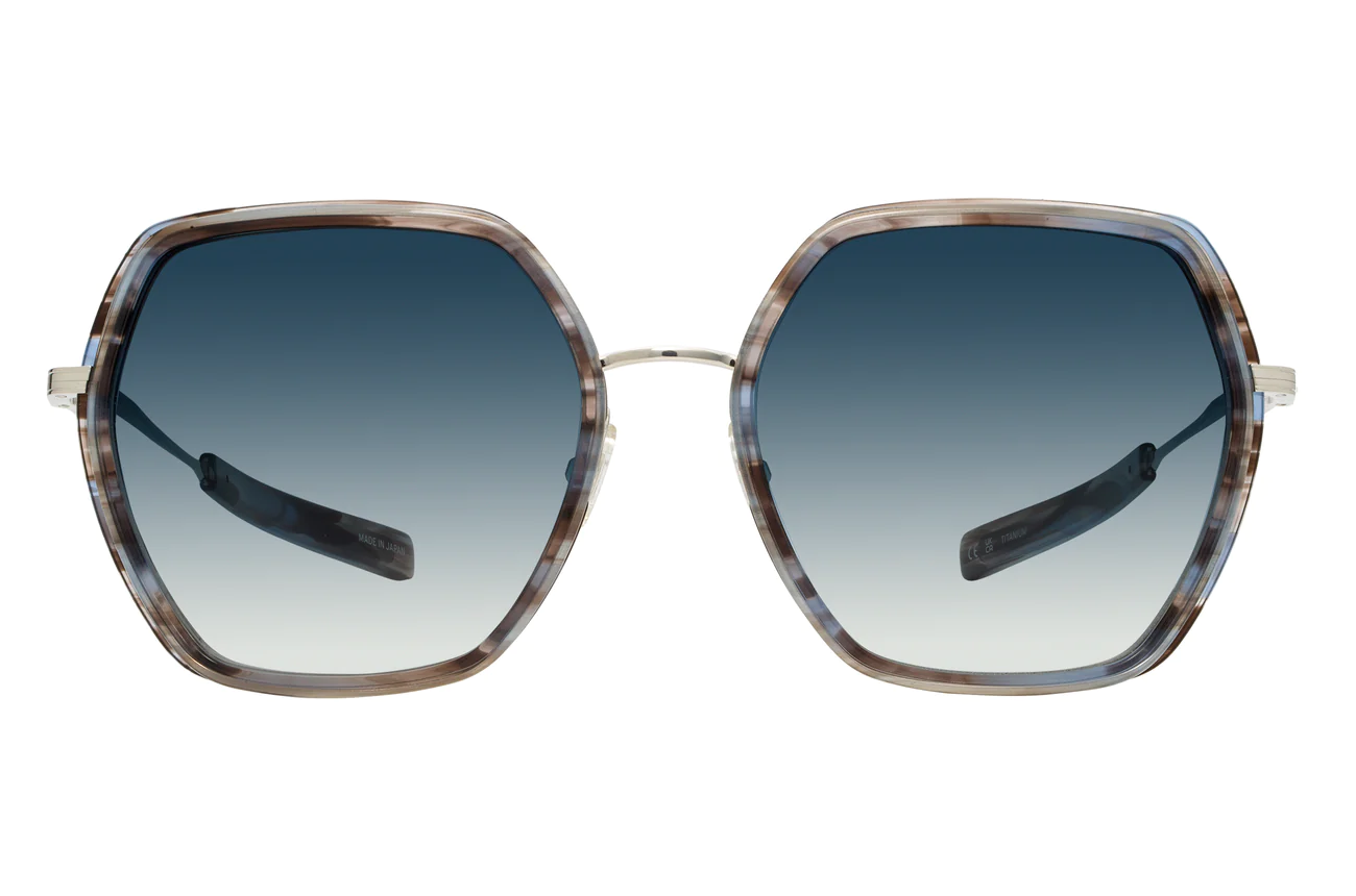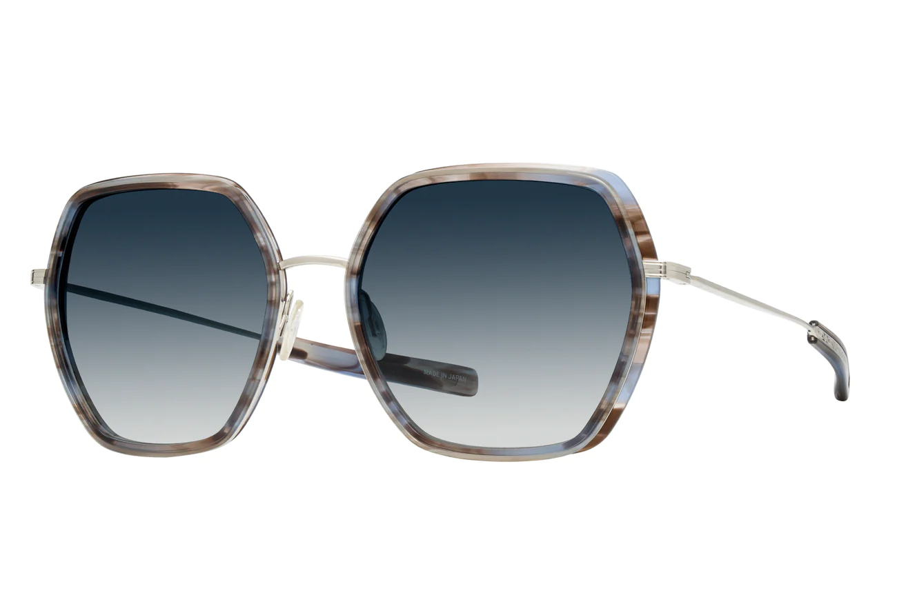This refined sunglass highlights architectural angles featuring titanium eyewire paired with Japanese acetate. The colors draw inspiration from the captivating beauty of landscapes and seascapes while jewelry-inspired filigree details revealed through the paddle temple highlight the interplay of materials.