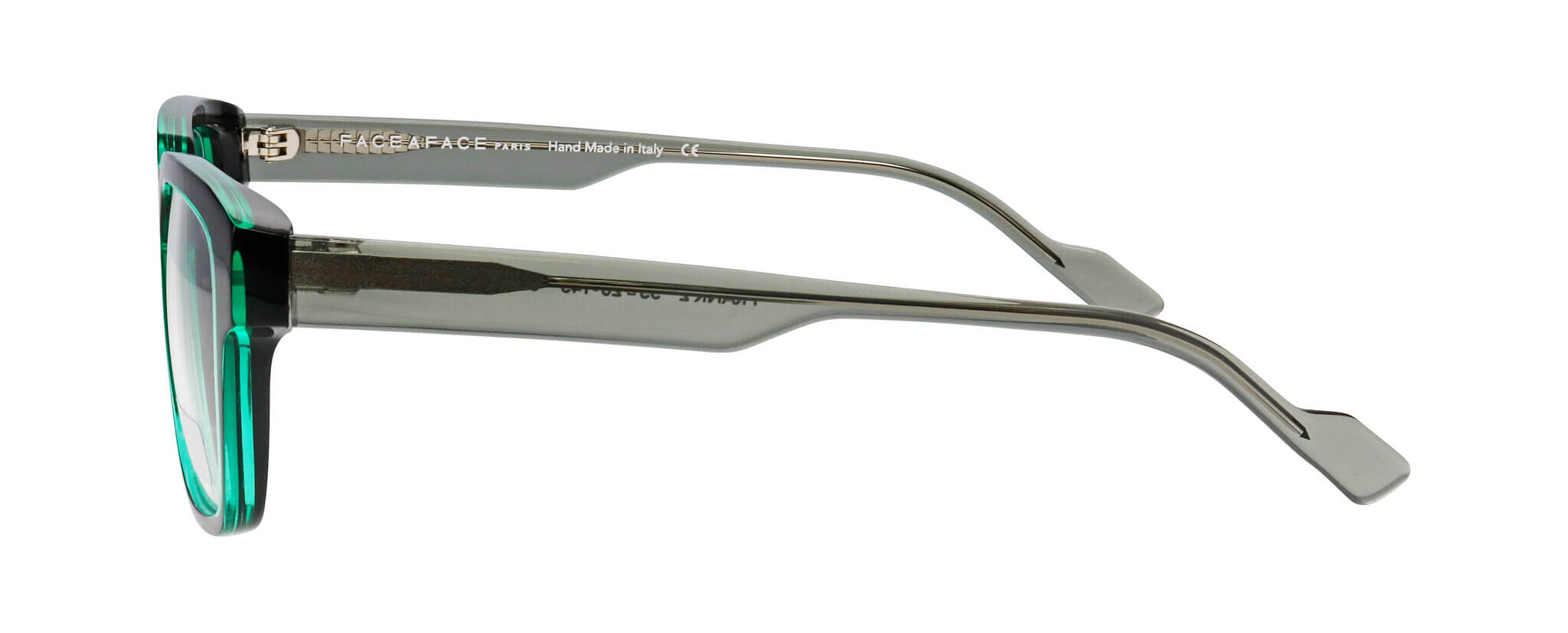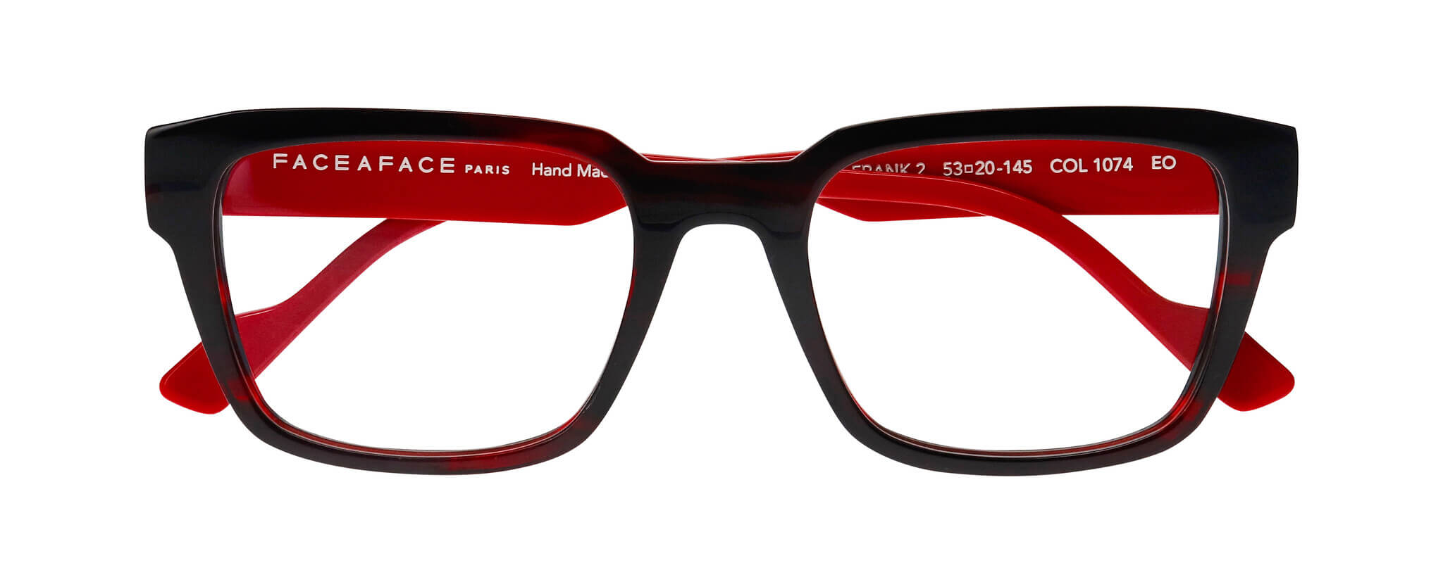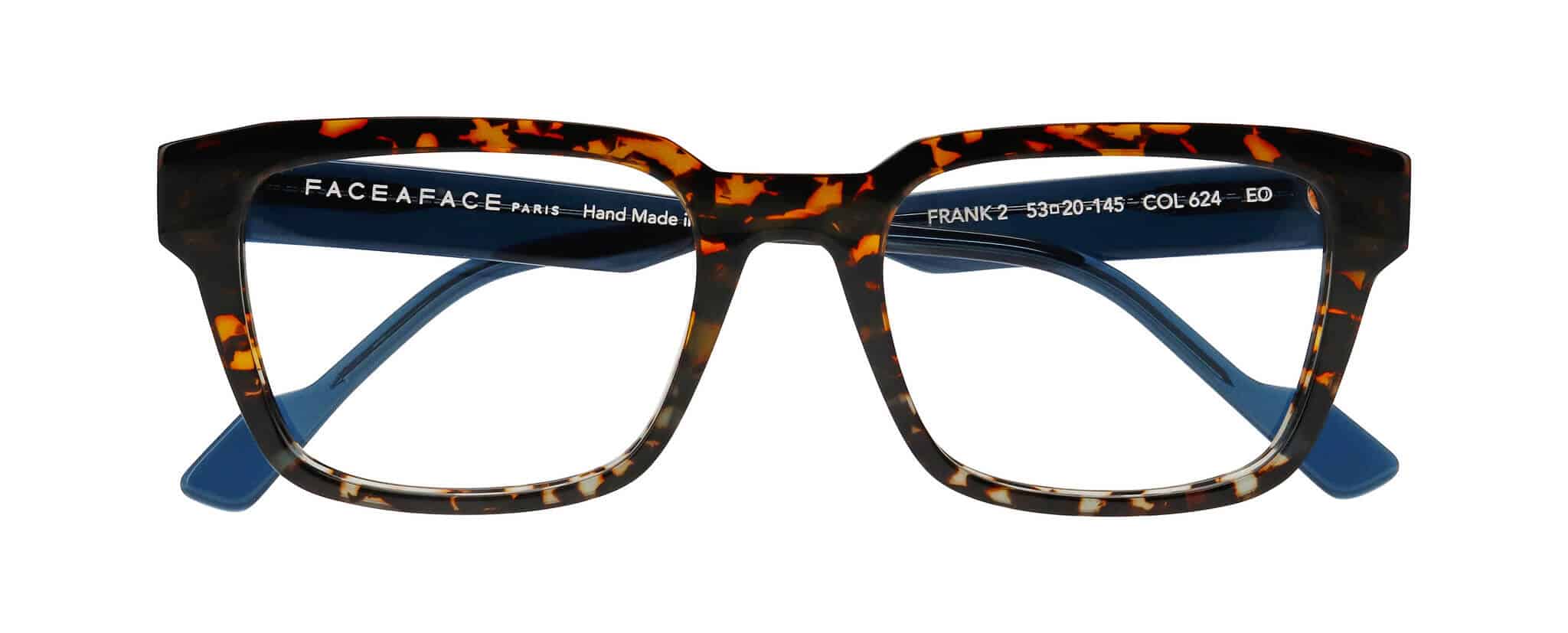 Generous, masculine, these spectacles are both sturdy and sculpted: a solid pin and five-piece hinge make for assertive glasses… you can always rely on them! A geometric stylised design cultivates the opulence of the materials: burnishing reveals the facets and highly carved cut of the glasses. A small and large rectangle with soft but striking shapes reveal the beauty of the exclusive FACE À FACE colours and materials: a deconstructed mosaic in grey is set against orange-red, while the ‘light line’ material is re-imagined on an opaque royal blue giving an extremely stormy spirit. Candour and awe come together in FRANK!